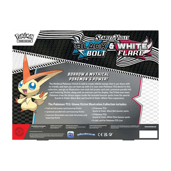 Release Date: 1 August 2025 Borrow a Mythical Pokémon’s Power!The Mythical Pokémon Victini is said to create infinite energy that it can share with its friends, and now you can team up with it in your own Pokémon TCG decks! In this collection, you get an illustration rare-style foil promo card and a premium parallel foil card featuring Victini, along with an oversize card for display. You’ll find even more Pokémon from the Unova region inside the included booster packs from the special Scarlet & Violet—Black Bolt and Scarlet & Violet—White Flare expansion. The Pokémon TCG: Unova Victini Illustration Collection includes:• 1 full-art foil promo card featuring Victini• 1 premium parallel foil card featuring Victini• 1 oversize illustration rare-style foil promo card featuring Victini• 2 Pokémon TCG: Scarlet & Violet—Black Bolt booster packs• 2 Pokémon TCG: Scarlet & Violet—White Flare booster packs• A code card for Pokémon TCG Live