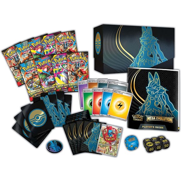 Release Date: 26 September 2025 Mega Evolve Your Strength to the Next Stage! Striving to become stronger, Pokémon of all types are putting everything on the line to become Mega Evolution Pokémon ex! Harness the strong aura of Mega Lucario ex, embrace the overflowing power of Mega Gardevoir ex, and team up with more of these powerful Pokémon that boast devastating attacks and massive HP. But consider your strategy carefully—extra power brings extra risks! Choose your Pokémon partners and prepare for the biggest battles you’ve ever seen in the Pokémon TCG: Mega Evolution expansion! The Pokémon TCG: Mega Evolution Elite Trainer Box includes: • 9 Pokémon TCG: Mega Evolution booster packs• 1 full-art foil promo card featuring Riolu or Alakazam• 65 card sleeves• 40 Pokémon TCG Energy cards• A player’s guide to the Mega Evolution expansion• 6 damage-counter dice• 1 competition-legal coin-flip die• 1 plastic coin• A collector’s box to hold everything, with 6 dividers to keep it organized• A code card for Pokémon Trading Card Game Live