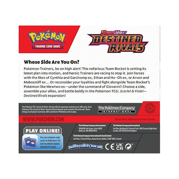 Release Date: 30 May 2025 Whose Side Are You On? Pokémon Trainers, be on high alert! The nefarious Team Rocket is setting its latest plan into motion, and heroic Trainers are racing to stop it. Join forces with the likes of Cynthia and Garchomp ex, Ethan and Ho-Oh ex, or Arven and Mabosstiff ex… Or reconsider your loyalties and fight alongside Team Rocket’s Pokémon like Mewtwo ex—under the command of Giovanni! Choose a side, assemble your allies, and battle boldly in the Pokémon TCG: Scarlet & Violet—Destined Rivals expansion! • Over 240 cards to collect• Over 85 Trainer’s Pokémon, including over 45 Team Rocket’s Pokémon• More than 15 Pokémon ex• More than 20 Trainer cards• More than 45 Pokémon and Trainer cards with special illustrations 36 Booster per box